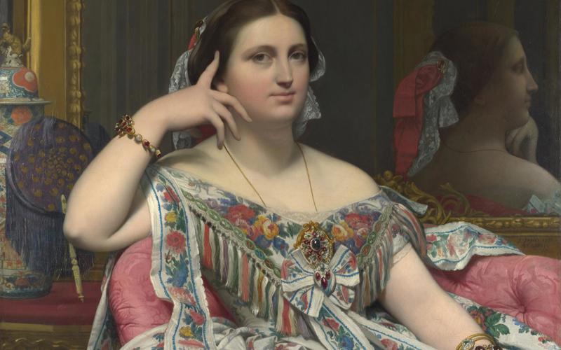 The final session explores dress in 19th-century painting, from the Empire silhouette to crinoline. We’ll consider how changing fashions coincided with new approaches to paint and surface, from Ingres to Manet and the Impressionists. We will be joined after the break by lecturer and designer Andrew Prince who will offer us very valuable information about the gems that adorn Madame Moitessier in her portrait by Ingres, as well as invaluable insights into the ways in which jewellery and adornments in paintings can convey ideas, as well as providing a showcase for wealth and taste.
